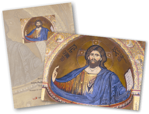 L'affresco che impreziosisce la copertina del La Grande Bibbia del Giubileo, riproduce uno degli splendidi mosaici del duomo di Monreale. È realizzato in Pictografia a fresco su grassello di calce, stesa su un supporto di legno stagionato 3 anni. I colori utilizzati sono a base di ossidi e ogni pezzo è ritoccato a mano, utilizzando una lente di ingrandimento, e rifinito in foglia d'oro.